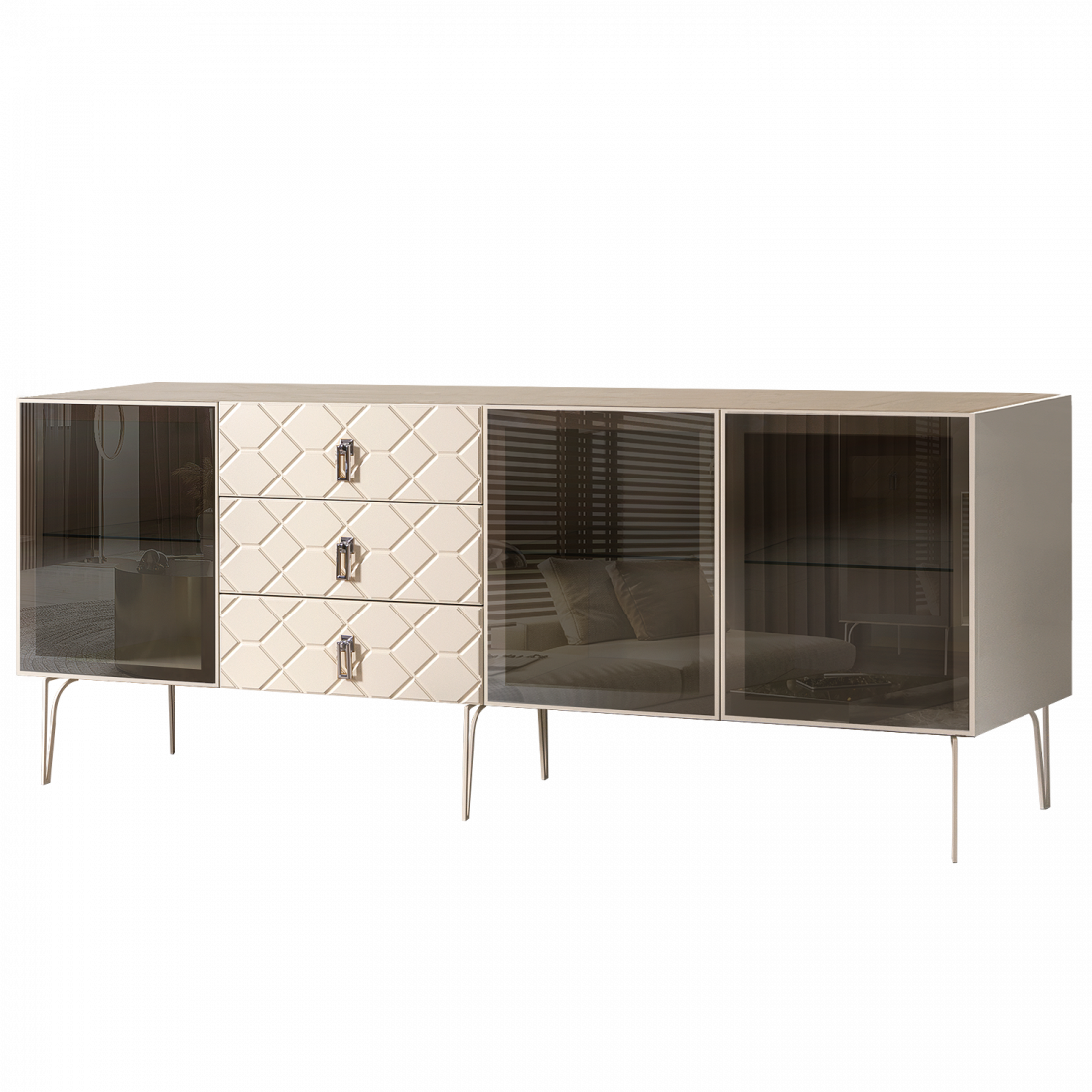 Стекло Stopsol меняет свои отражающие свойства под воздействием источников света. Поверхность, отражающая свет, мягко скроет содержимое вашего комода или витрины.