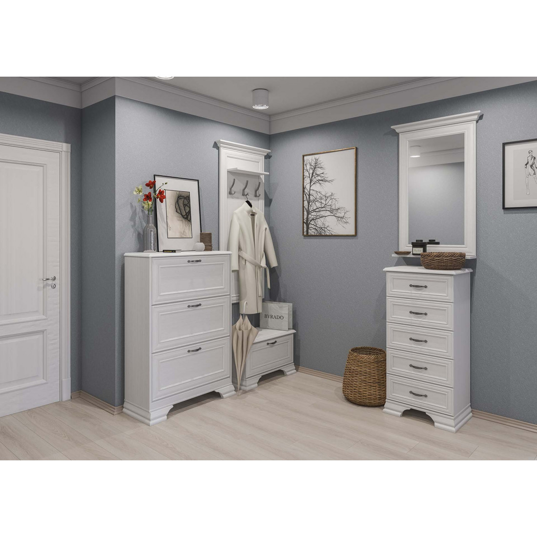 Мебель для прихожей Юнона от фабрики Мебель-Неман композиция 1 - новинка 2019 года в классическом стиле с отделкой структурной фактуры, обрамленная рамочным фасадом, где металлические ручки выгодно подчёркивают стиль и изящество, всегда актуальна и востребована.